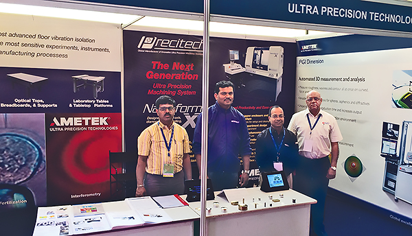 The show was organized by the Optical Society of India (OSI) with a focus on the design, fabrication, and testing of aspheric, freeform, diffractive, large size, micro, and nanophotonic optics. On display in the booth was a passive vibration isolation table from TMC, a Taylor Hobson, PGI 1200 Form Talysurf, and Precitech diamond turned part samples. Precitech also presented the paper, "Applications and Benefits Related to the use of a CNC B Axis" (Chinese) specifically focused on its advantages in the manufacturer of IR and Diffractive optics. The demos attracted many visitors to the booth where AMETEK's team of Indian based sales, service, and application engineers were ready to answer technical questions from the growing Indian ultra precision manufacturing community.